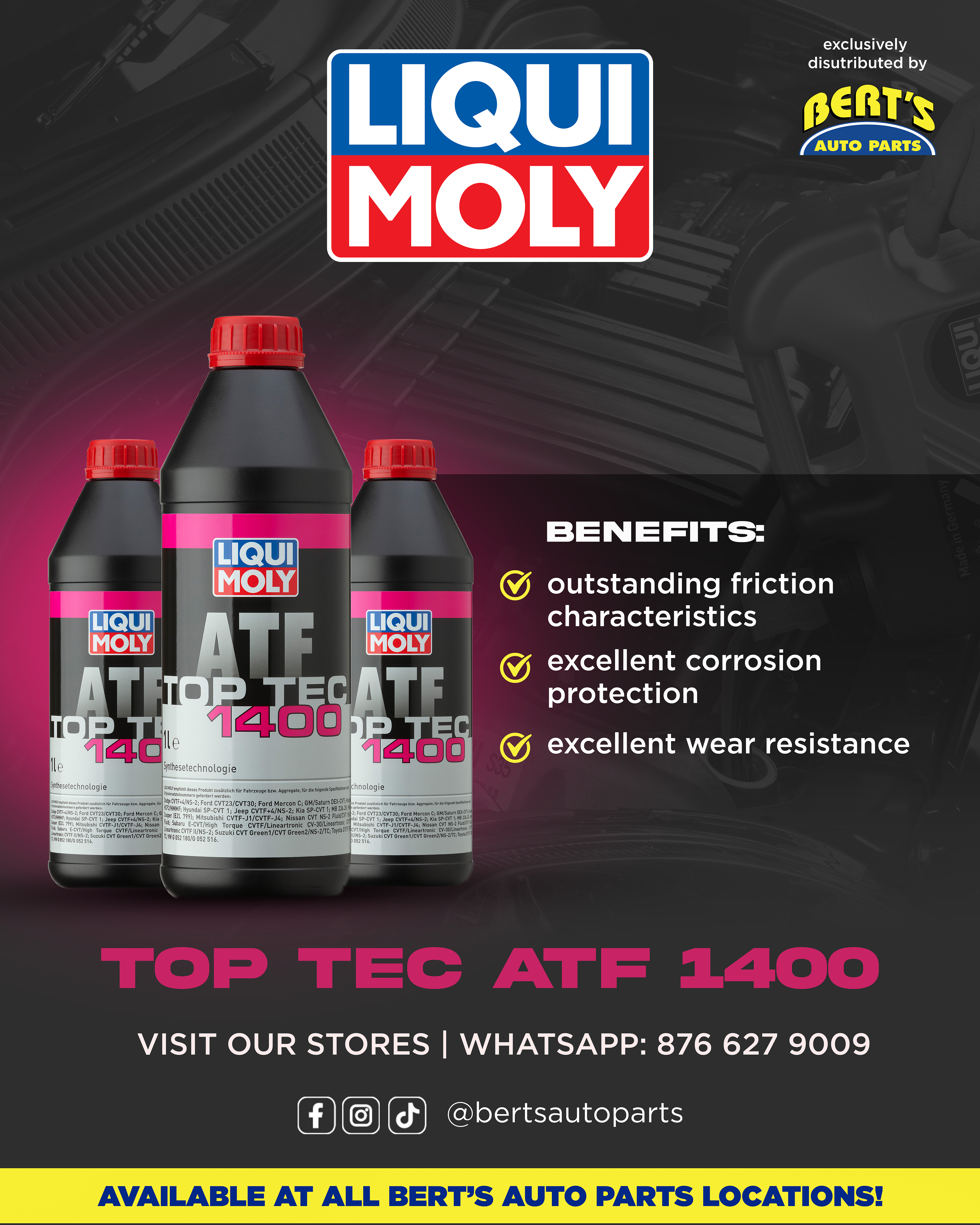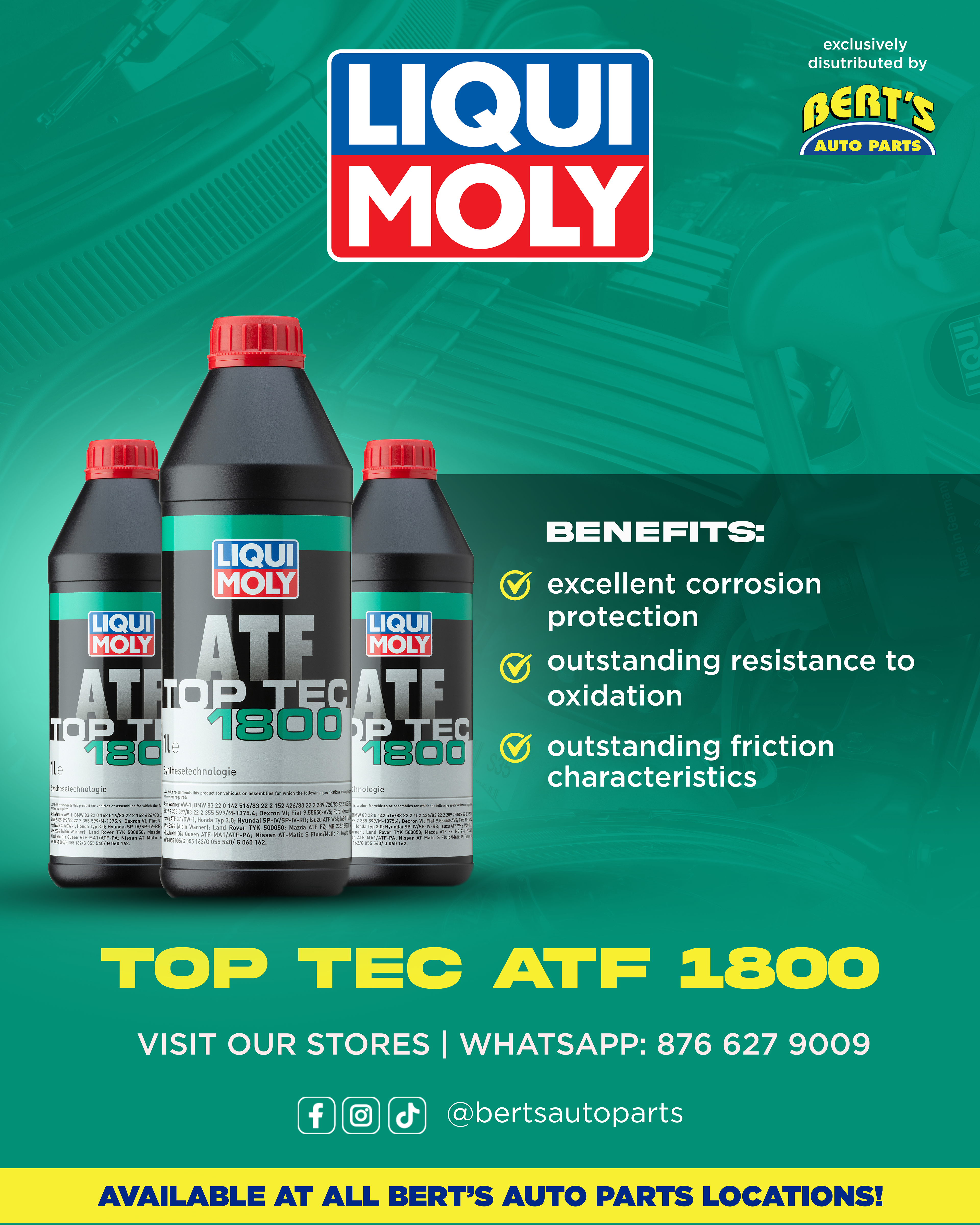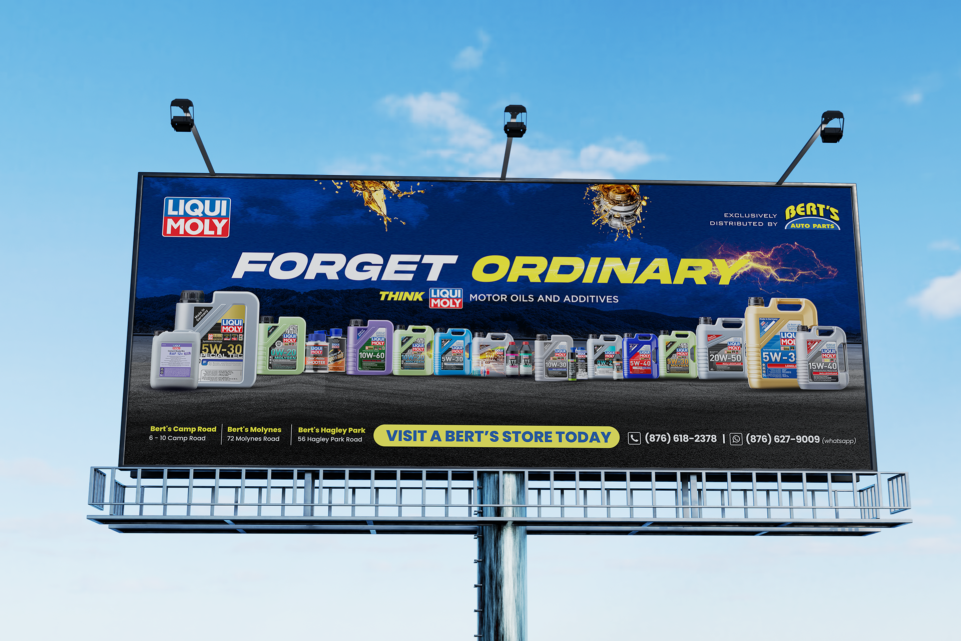 Large-format billboards featured Liqui Moly oils and selected automotive products available at Bert’s Auto Parts, designed for immediate recognition and legibility at speed. The layouts prioritized strong hierarchy, minimal copy, and bold product presentation to cut through high-traffic environments.