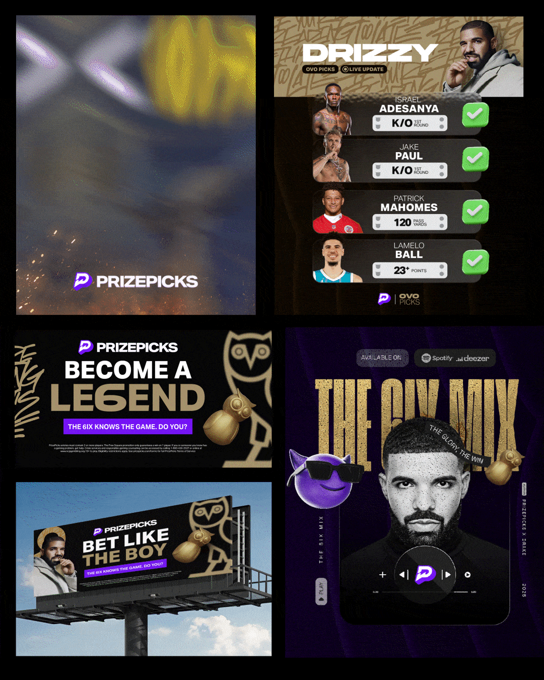 This passion project explores what a collaboration between PrizePicks and OVO could look like. Inspired by the intersection of sports, music, and culture, the concept imagines a partnership that blends the excitement of daily fantasy with the influence of one of Toronto’s most iconic cultural forces.